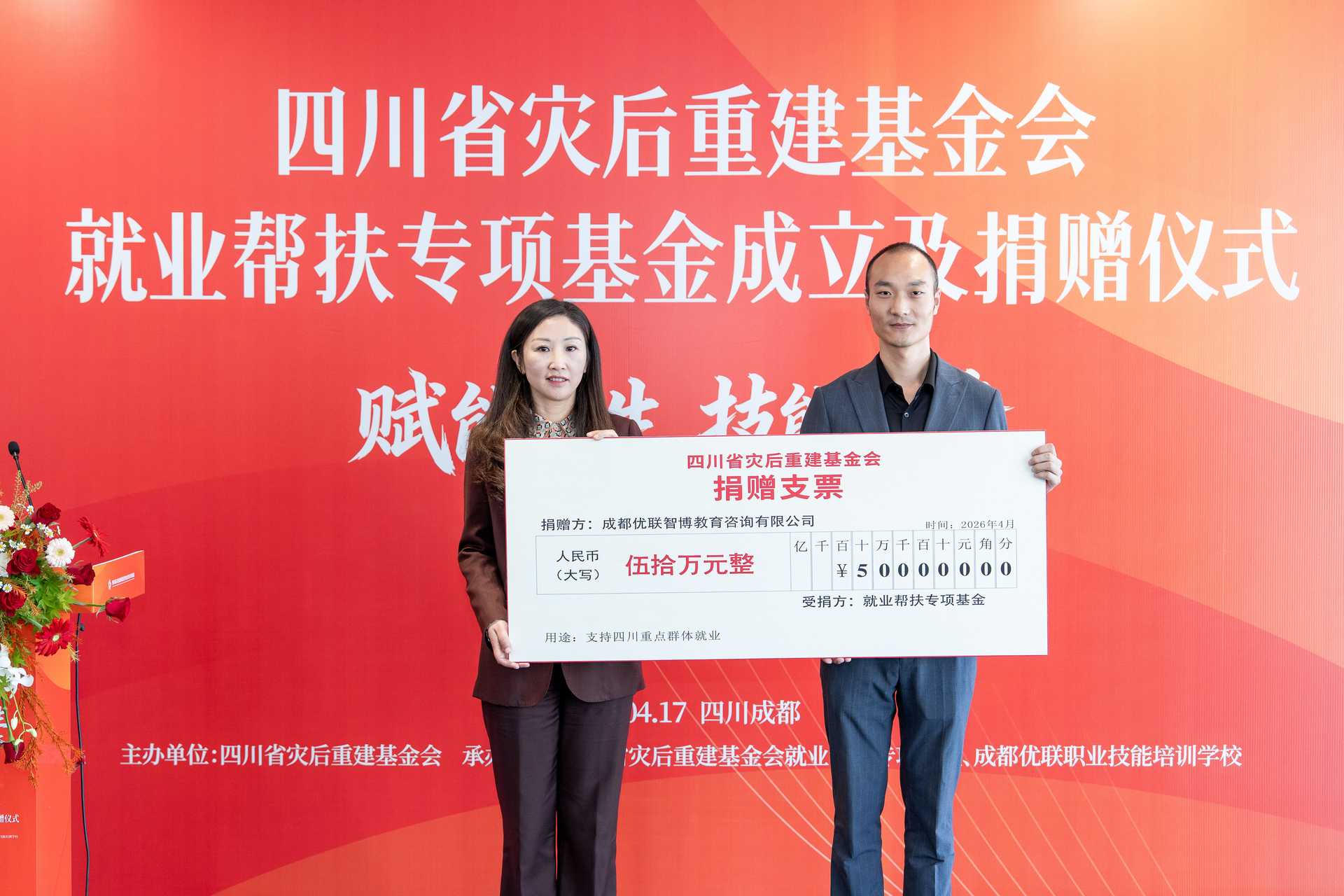 2026年4月17日,四川省灾后重建基金会就业帮扶专项基金成立暨捐赠仪式在成都举行。