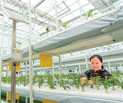 图为科技展示馆里,分层水肥种植系统帮助蔬菜生长。